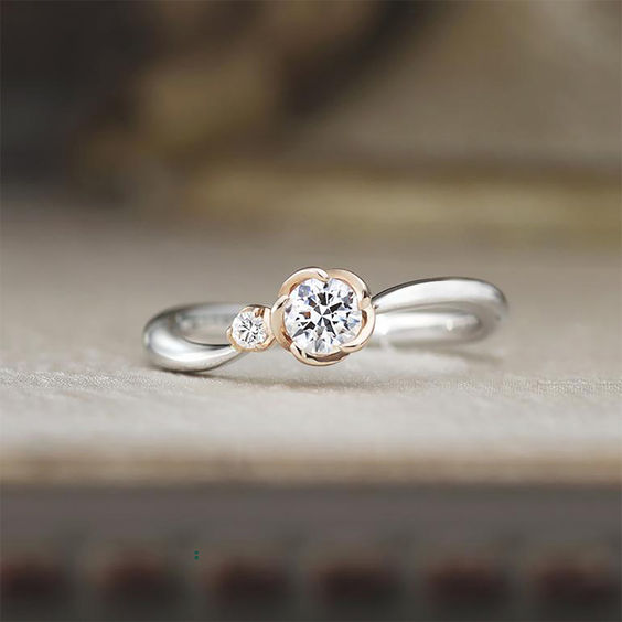 花びらでダイヤモンドを包み込んだような、キュートで可愛らしい婚約指輪(エンゲージリング)。サイドのメレダイヤモンドは、花開く前のつぼみの様に愛らしさを添える。