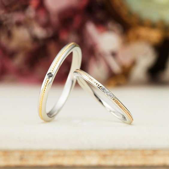 精巧なミル打ちが施された結婚指輪(マリッジリング)。繊麗な印象を受ける細身のデザインに並んだダイヤモンドのさりげない輝きが美しい。きれいに並んだミル打ち加工が、リングデザインのポイント。