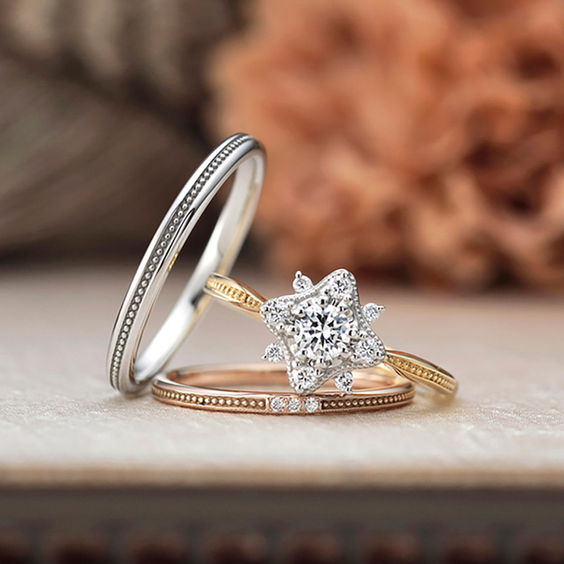 華やかで個性的なアンティーク調の婚約指輪〈エンゲージリング〉。センターのダイヤモンドを、囲うように設置されたメレダイヤモンドと、ミル打ちを施した地金の輝きが視線を集 める。