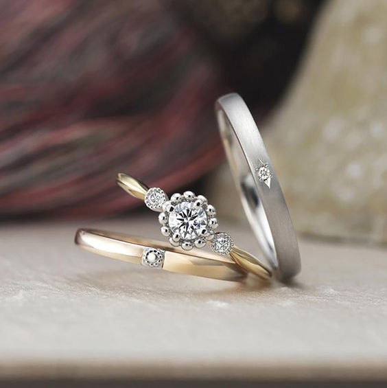 美しく咲いた花のようなデザインの婚約指輪(エンゲージリング)に、シンプルなストレートデザインの結婚指輪(マリッジリング)を組み合わせたセットリング。丸く囲むミル打ち加工が、華やかさを添える。