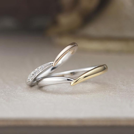 細身のシルエットにV字のカーブラインの結婚指輪(マリッジリング)。2色の色合いは地金の輝きを楽しむとともに、ダイヤの白い輝きも楽しめるデザイン。