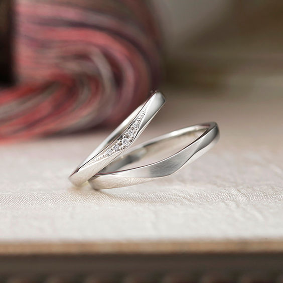指馴染みの良い、U字カーブの婚約指輪(エンゲージリング)と、結婚指輪(マリッジリング)のセットリング。計算された丸み・厚みで、美しい重ね付けのラインと、なめらかな指通りを追及したデザイン。