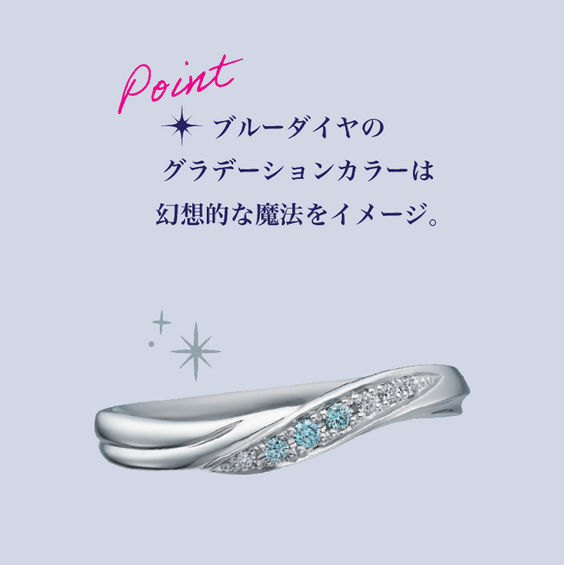 フェアリー・ゴット・マザーがシンデレラを変身させるときのキラキラと輝く魔法の軌道をイメージして、奇跡の瞬間を美しい流線とダイヤモンドで表現したリングです。