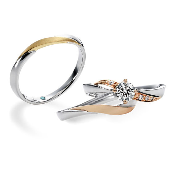 婚約指輪はボリューム感をだしつつも透かしが可愛らしいデザイン。結婚指輪はメンズ、レディース共にシンプルで落ち着いた印象のコンビネーションタイプです。