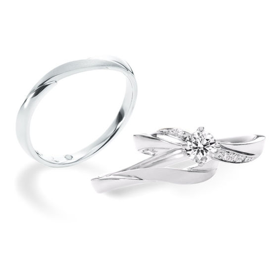 婚約指輪はボリューム感をだしつつも透かしが可愛らしいデザイン。結婚指輪はメンズ、レディース共にシンプルで落ち着いた印象のコンビネーションタイプです。
