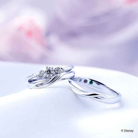 マリッジリングはアリエルの尾ひれを、流れるようなラインで表現。立体感のあるフォルムは、どの角度から見てもプラチナの洗練されたきらめきを楽しめます。内側には貝殻モチーフが刻印され、シンプルながらもアリエルの世界観を細部まで繊細にデザインされたジュエリーです。