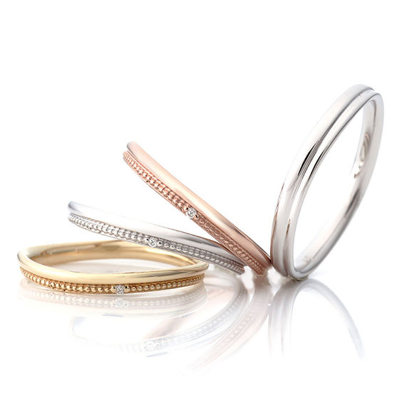 流れるようなカーブラインにミル打ちとセンターのダイヤモンドがアクセントに。まるで2本のリングを着けているようなデザインです。