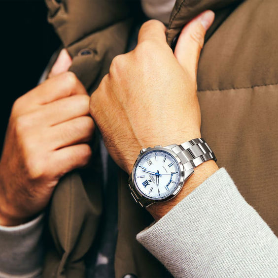 ガラス径を大きくしたワイドフェイスと薄型ケースで、シンプルかつスポーティなデザイン。サファイアガラスの裏の外周にブルーの蒸着を施し、ブランドカラーであるブルーが鮮やかに輝きます。装着感の良い桟残し構造のバンドを採用し、チタンケースとバンドにはザラツ研磨を施すなど、細部まで上質さにこだわりました。ワールドタイムを直感的に操作できるスマートアクセスや電波受信、タフソーラー、針位置自動補正、ハイブリッドマウント構造を持つタフムーブも搭載し、機能も充実しています。