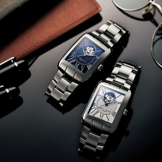 文字盤の小窓から機械式時計のテンプの動きを見せる”ハートビート”搭載のクラシックな角型”カレ”コレクション。緩やかにカーブするケースは腕にフィットし、大ぶりのローマンインデックス、クル・ド・パリ装飾、ミニッツトレイル、ブレゲ針とそしてオニオンリューズ。クラシックな要素があふれる、どのシーンでも自信を持って身につけていただける一本です。