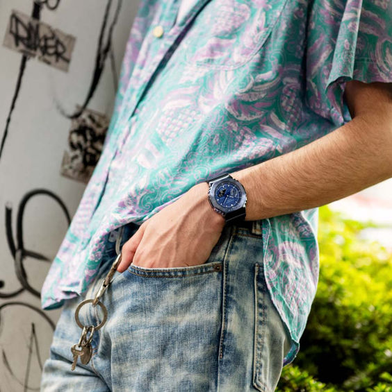 ベゼルカバー部分に硬質なステンレス素材を採用。ステンレスのベゼルに、円周状のヘアライン仕上げを施し、シックなデザインとなっています。また、文字板に蒸着処理を施し、GA-2100らしいシンプルデザインをシャープかつスタイリッシュに引き上げました。更にバンドには徐々に変化するチェッカーパターンのテクスチャをさりげなく入れ、カジュアルな印象の樹脂バンドに上質感をプラスしています。初代から受け継がれるコンセプトはそのままに、時計としてのクオリティを追求し外装や装着性の進化に磨きをかけたモデルです。