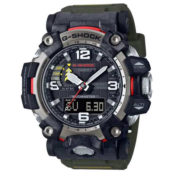 土砂や泥濘の中での任務に求められる防塵・防泥構造はそのままにダウンサイジングを行い、装着感の向上を図っています。樹脂の中にカーボン繊維を練り込み、金型で熱プレスし固めて成形したフォージドカーボンベゼルと、カーボンコアガード構造のケースにより小型化を実現。ステンレス製のボタンパイプとシリコーン製の緩衝素材を組み合わせたマッドレジストボタンにより薄型化を実現しました。機能面では電波ソーラーに加えてトリプルセンサーを搭載し、方位、気圧・高度、温度情報を取得可能。アラビア数字の大型インデックスと矢印型の極太の針を使用し、ダブルLEDライト、サファイアガラス等により高い視認性も確保しています。バンドは重機のグリップやすべり止めをイメージしたテクスチャーをつけ、ボタンには操作性を高めるローレット加工を施し、実用的で力強いデザインに仕上げました。陸上での過酷な任務に当たるプロフェッショナルをサポートするG-SHOCKです。