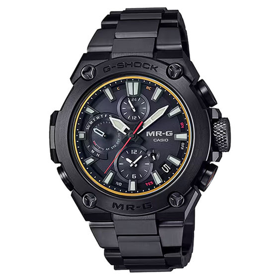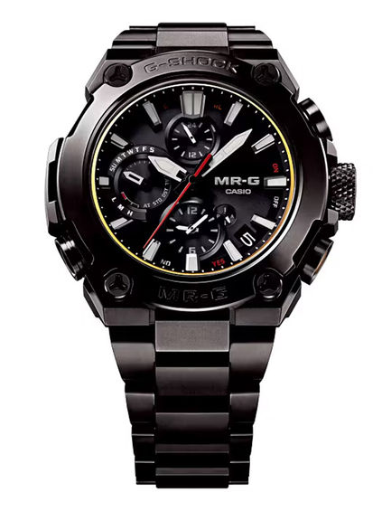 独自の小型化技術により腕に馴染むサイズ感を実現すると共に、文字板はミニマルデザインに仕上げ、日常的な実用性を追求。チタンのケース・バンドにはDLC処理と深層硬化処理を施し、黒を基調とした配色を採用しました。黒の濃淡で表現する「墨の五彩」をイメージし、コンパクトでありながらMR-Gらしい威風堂々とした存在感を放ちます。また、標準電波、Bluetooth®による時刻修正に対応し、時刻精度も追求。スマートフォン連携による多機能の簡単操作も可能にしました。強さと美しさを宿した造形美と、信頼性を生み出す先進の機能が融合し、シンプル&コンパクトなスタイリングを実現したMR-Gです。