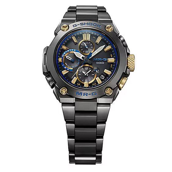 デザインモチーフの「勝色」は日本に古くからある濃い紺色のこと。元々は褐色または搗色と表記されていましたが、武士たちに「勝つ色」として好まれ、鎧や甲冑などによく使われるようになりました。独自の小型化技術の開発により腕に馴染むコンパクトなサイズ感を実現したベースモデルMRG-B1000に、ベゼル内側やインダイアル、ロゴにあしらわれた「勝色」がアクセントになっています。機能面では、電波受信機能とBluetooth®通信機能によるスマートフォンとの連携に対 応し、実用性も兼ね備えました。